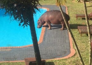 En morgen i 2020 sto denne flodhesten ved svømmebassenget …